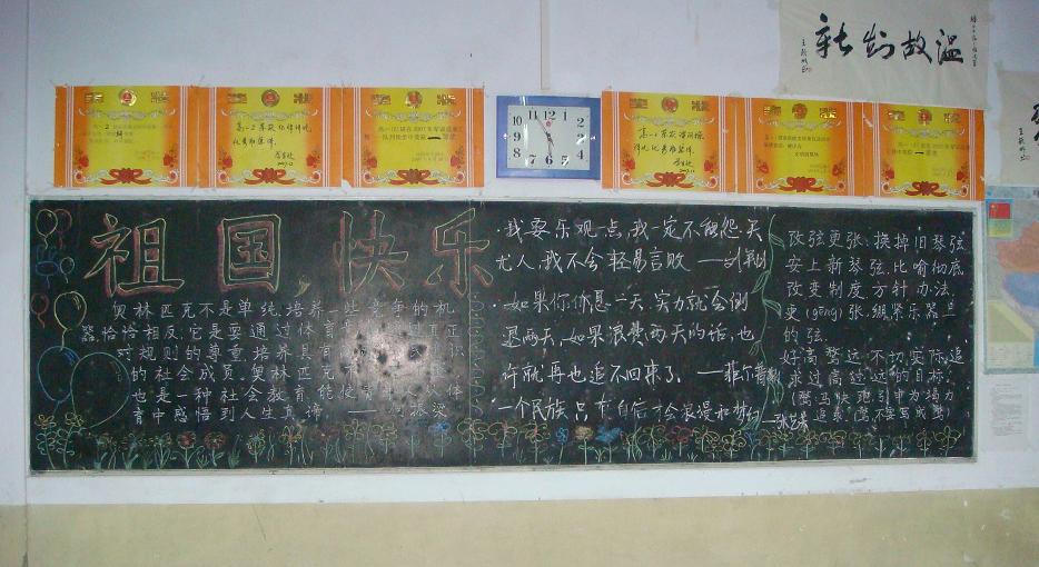 9月27日,高二年级各班进行了“迎国庆 颂奥运”黑板报宣传展示。各班进行了积极充分的准备,板报设计新颖独特,形式灵活多样,内容丰富精彩。学生会同学进行了参观学习,他们都纷纷表示此次板报不仅赞扬了奥运健儿的拼搏进取精神,展示了祖国欣欣向荣的崭新面貌,而且体现了各班同学丰富的创造力和积极向上的精神面貌。