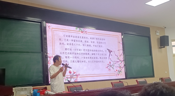 讲座伊始,路老师给同学们普及了灯谜的概念、由来传说、发展演变名词术语、结构规则、猜制方法技巧等基础知识,带领同学们进行了一些简单的民间谜语赏析。同学们认真听讲,积极与老师互动,努力理解和掌握灯谜的知识和技巧。